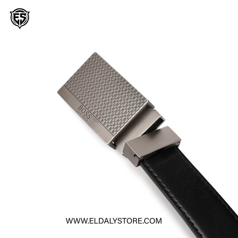 <li><strong>Modern Buckle:</strong> Features a sleek, gunmetal-tone plate buckle with a sophisticated micro-pattern texture.</li>