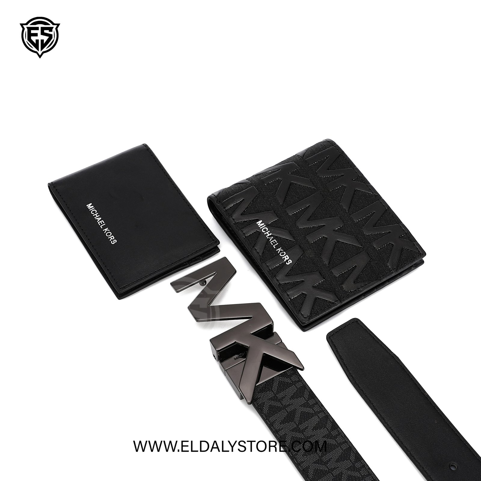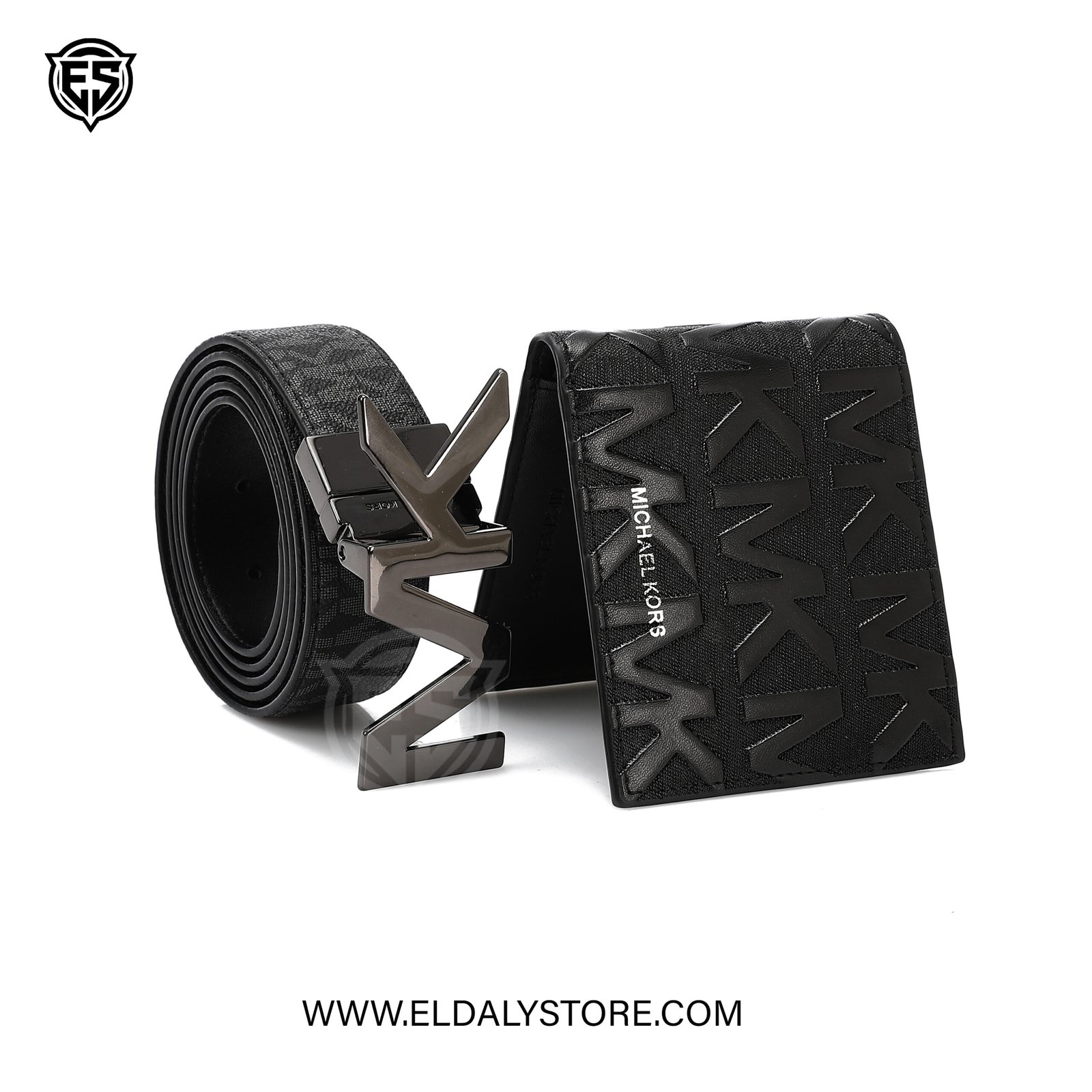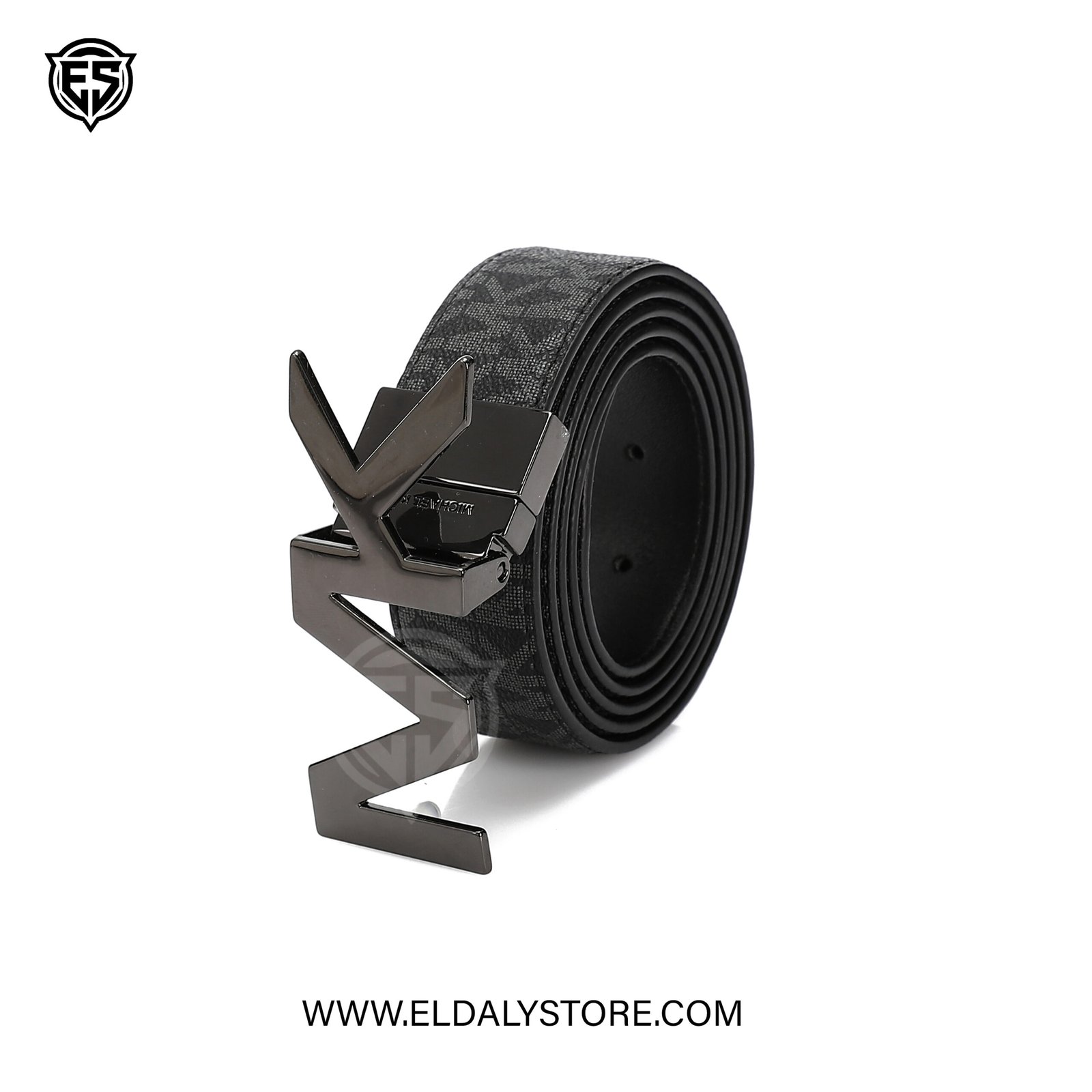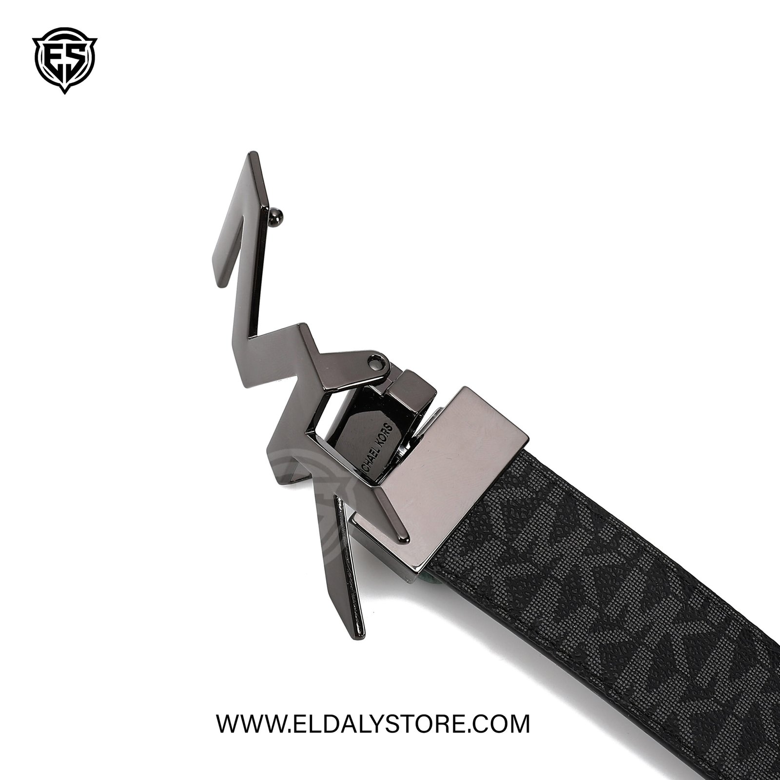 • Bold MK Buckle: A striking, gunmetal-finish “MK” plaque buckle adds a high-fashion focal point to your attire.