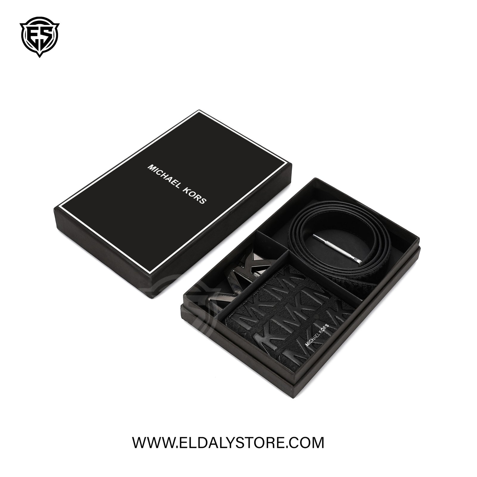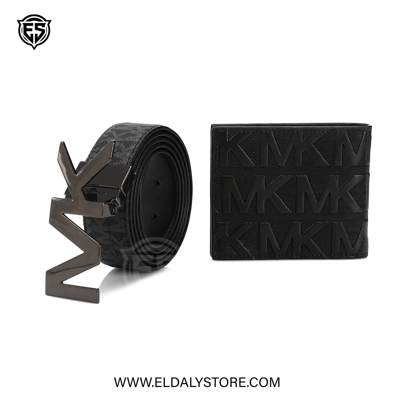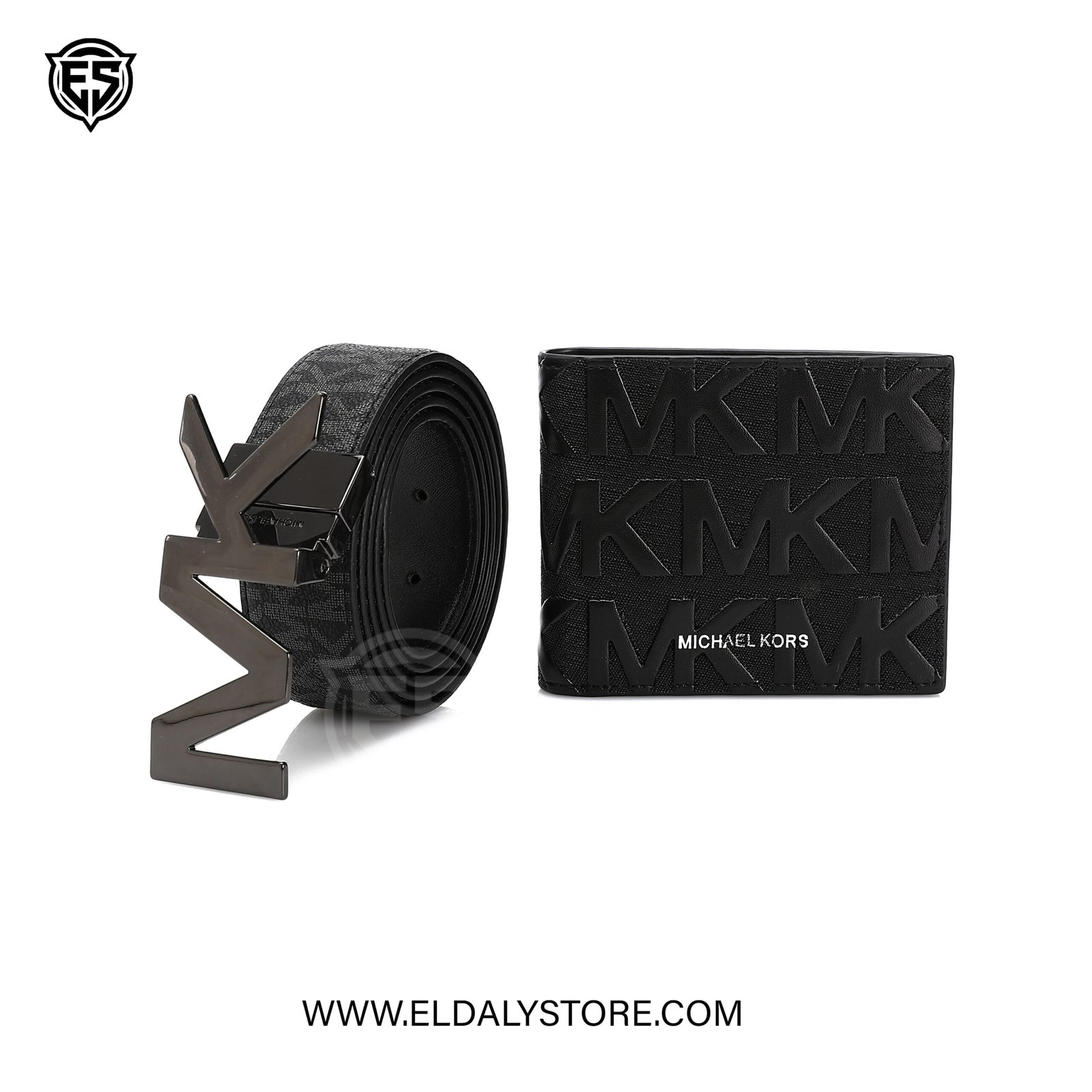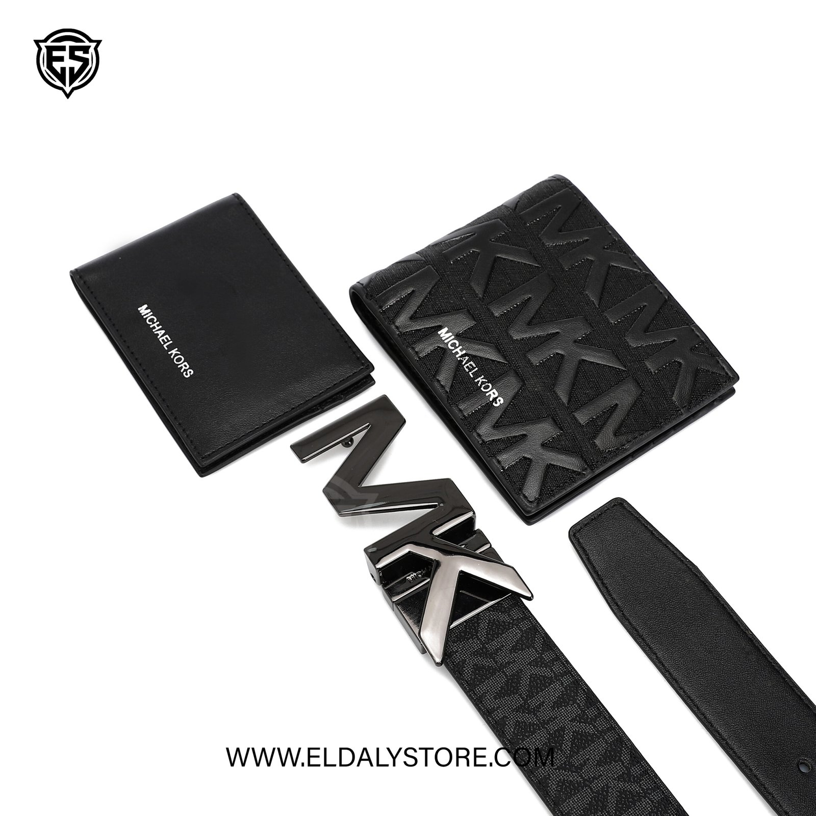 • Bold MK Buckle: A striking, gunmetal-finish “MK” plaque buckle adds a high-fashion focal point to your attire.