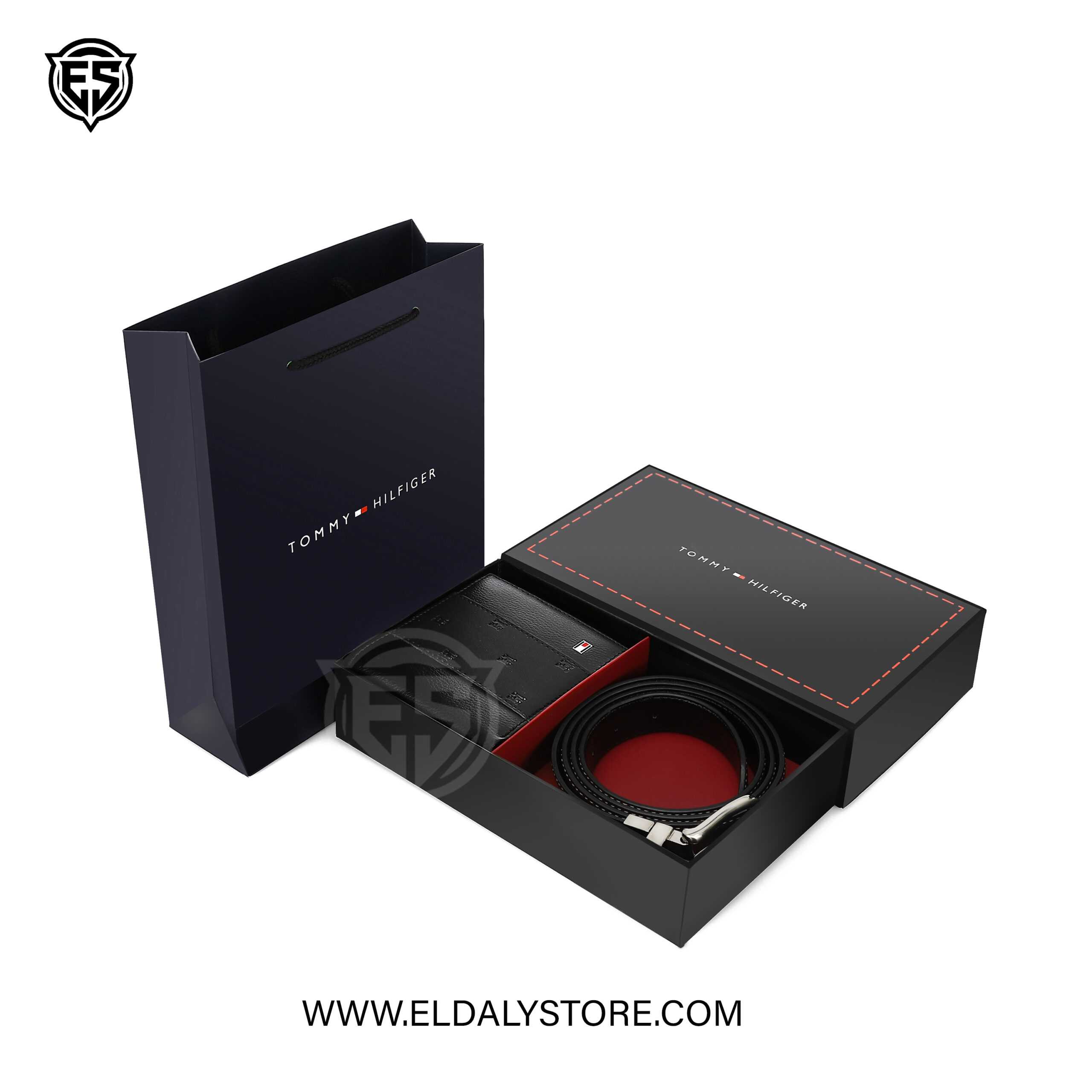 The set arrives in a sophisticated, branded Tommy Hilfiger box with red contrast stitching, making it an excellent