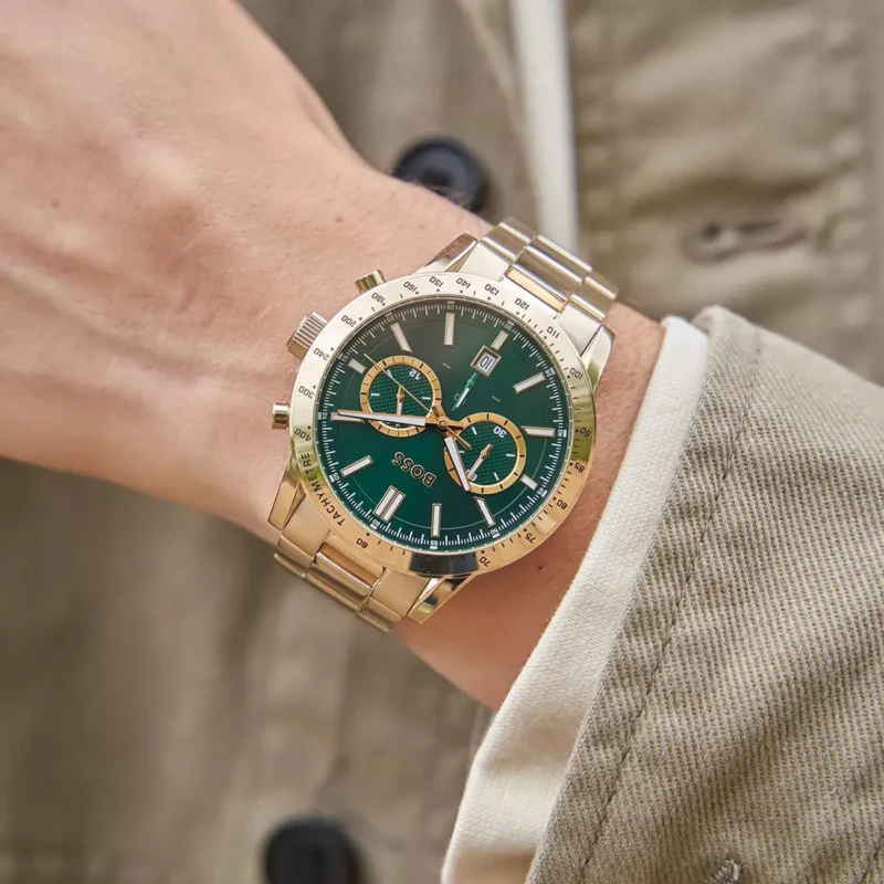 Special Features: Chronograph, Tachymeter bezel, Date window, Luminous hands & markers, Elegant gold-tone bracelet