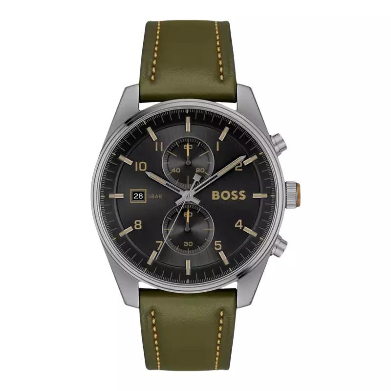 Special Features: Mineral Crystal, Chronograph sub-dials, Date window at 9 o’clock, Elegant olive green leather strap