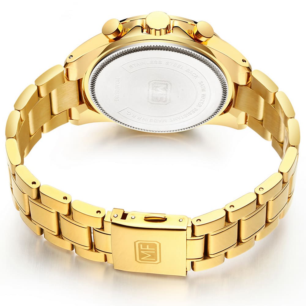 mf0278g mini focus watch for men black dial stainless steel metal gold strap quartz battery analog chronograph 15