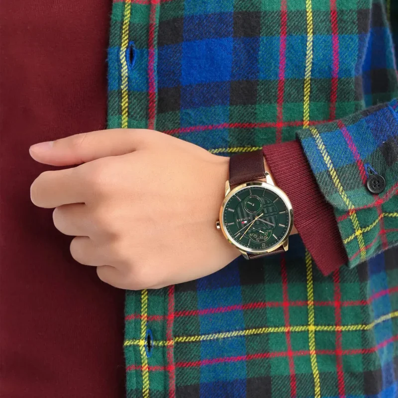 Special Features: Multifunction with Day & Date – Scratch-resistant mineral crystal – Green dial with gold-tone accents – Tommy Hilfiger logo at 12 o’clock