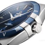This Omega Leather Watch for Men features a sleek steel case and a striking blue dial. Certified as a Master Chronometer, it offers precise timekeeping and reliable performance. Its classic design combines elegance with durability, making it a perfect everyday accessory.