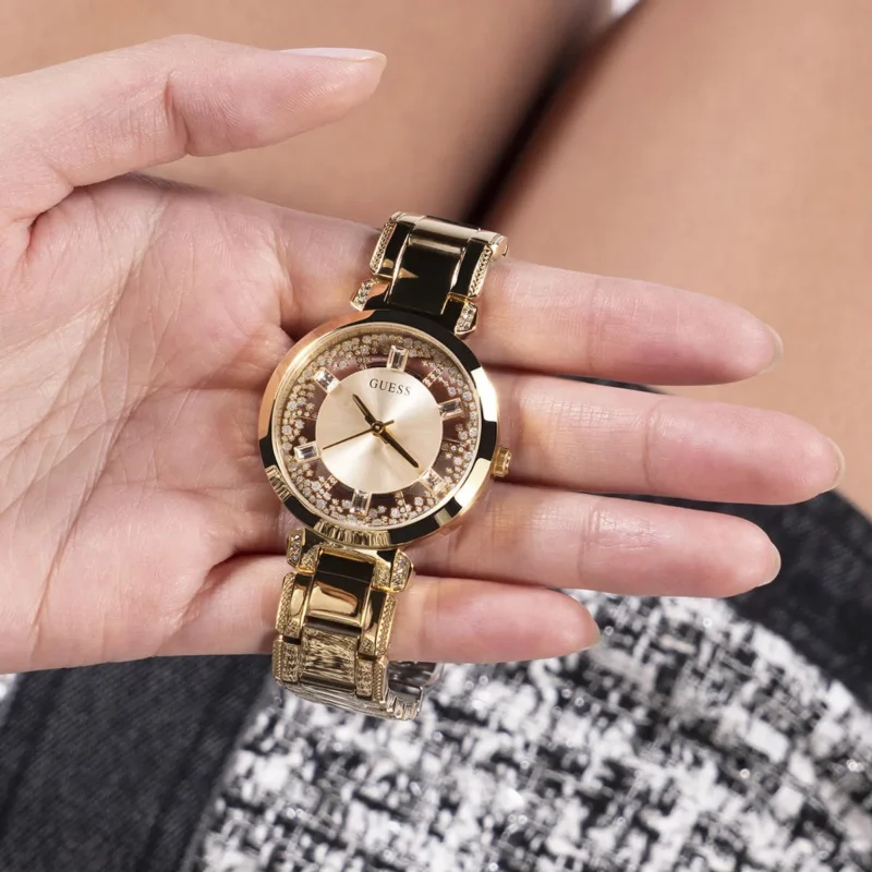 Special Features: Transparent crystal dial, crystal-accented bezel, elegant gold-tone design