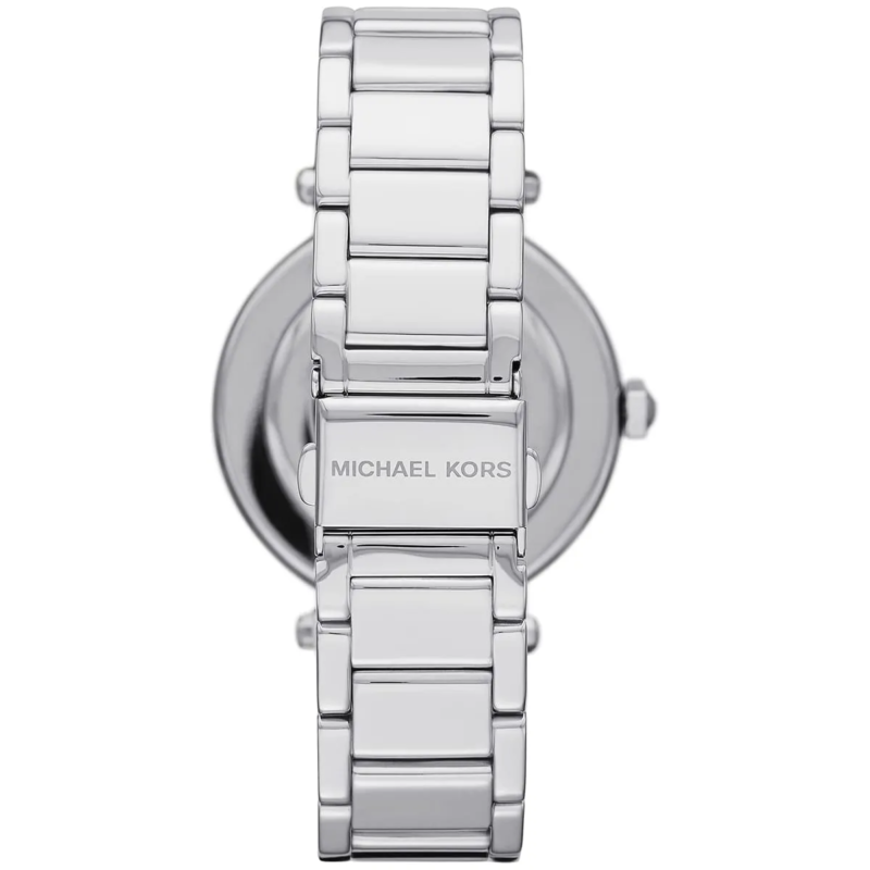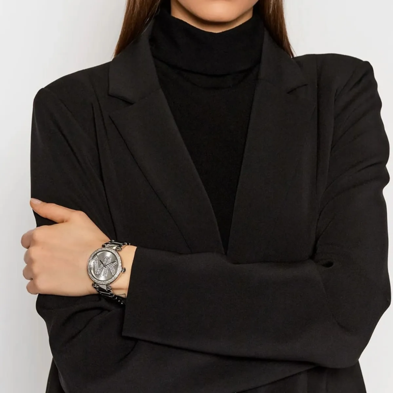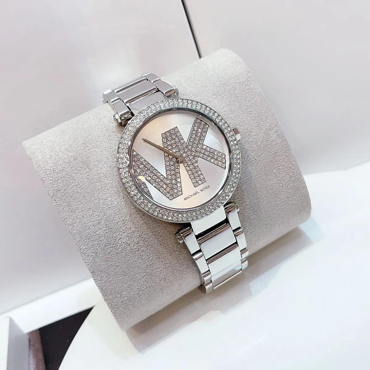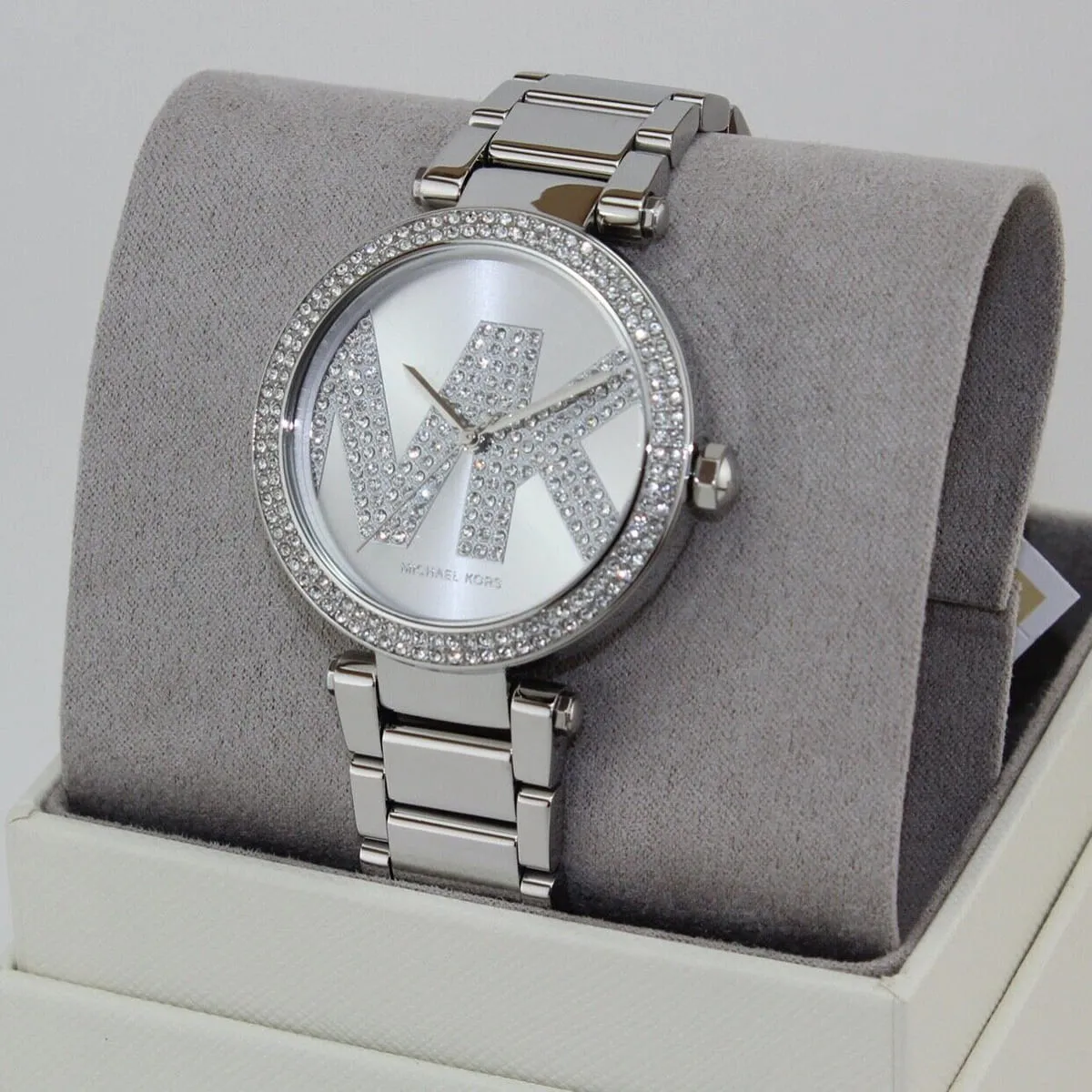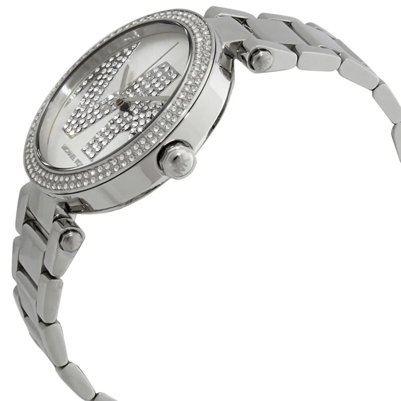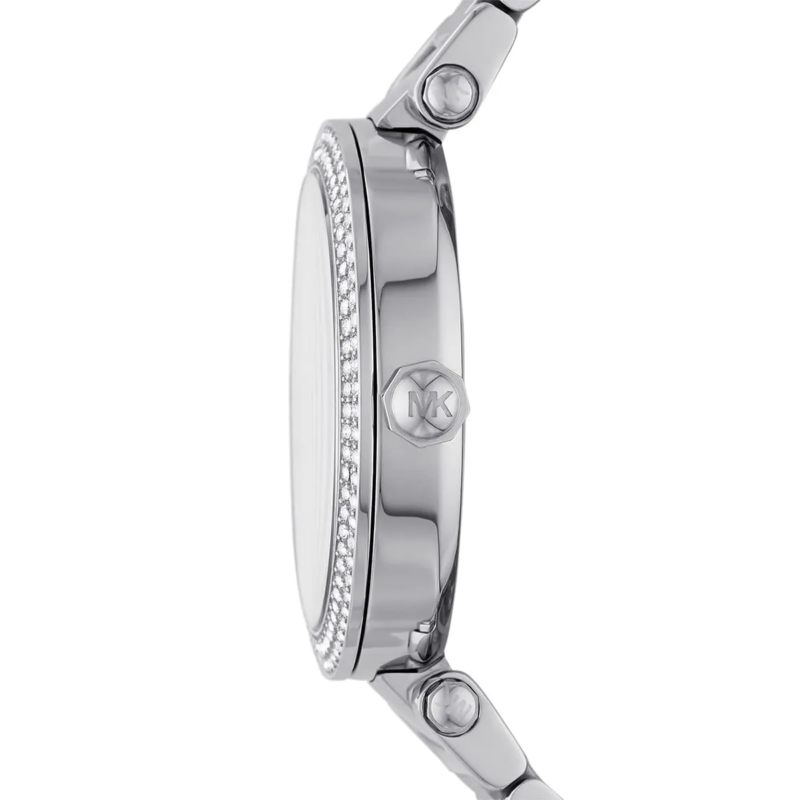 Special Features: Pavé crystal-set bezel, sunray silver dial, MK logo pattern, polished stainless steel bracelet